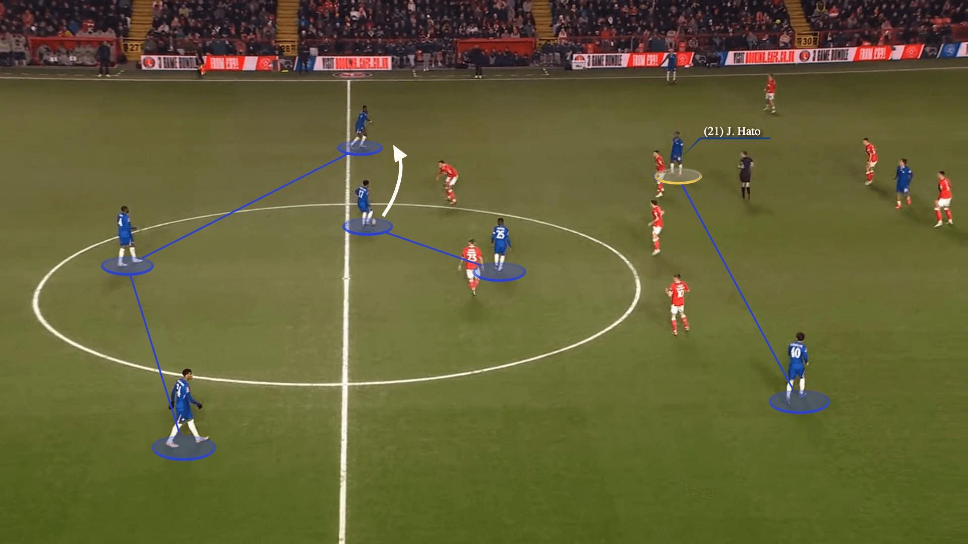 这次进攻包含了切尔西形成菱形中场时的四名中场中的三位。中卫韦斯利-福法纳将球传给9号位马克-吉乌,从而分开了中场,吉乌再将球做给10号位若昂-佩德罗。